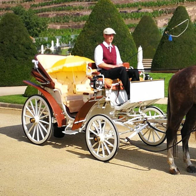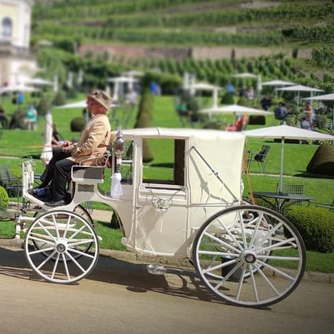 Mit unseren eleganten Hochzeitskutschen und prachtvollen weißen Pferden wird Ihre Ankunft zu einem ganz besonderen Moment der lange in Erinnerung bleibt.