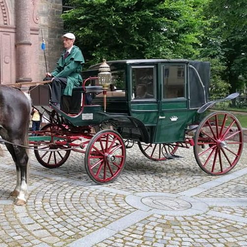 Große geräumige Kutsche für 4 Personen, offen und geschlossen zu fahren, original englische Anspannung. Auch geeignet für Doppelhochzeiten.